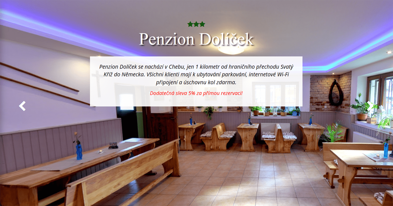 Penzion Dolíček nabízí komfortní ubytování jen 1 kilometr od hranic s Německem. V okolí penzionu je mnoho turistických i cyklistických tras. Můžete si také užít projížďky na koni po předchozí domluvě.