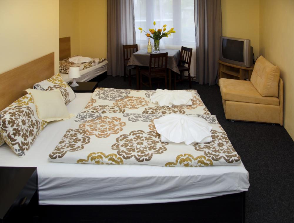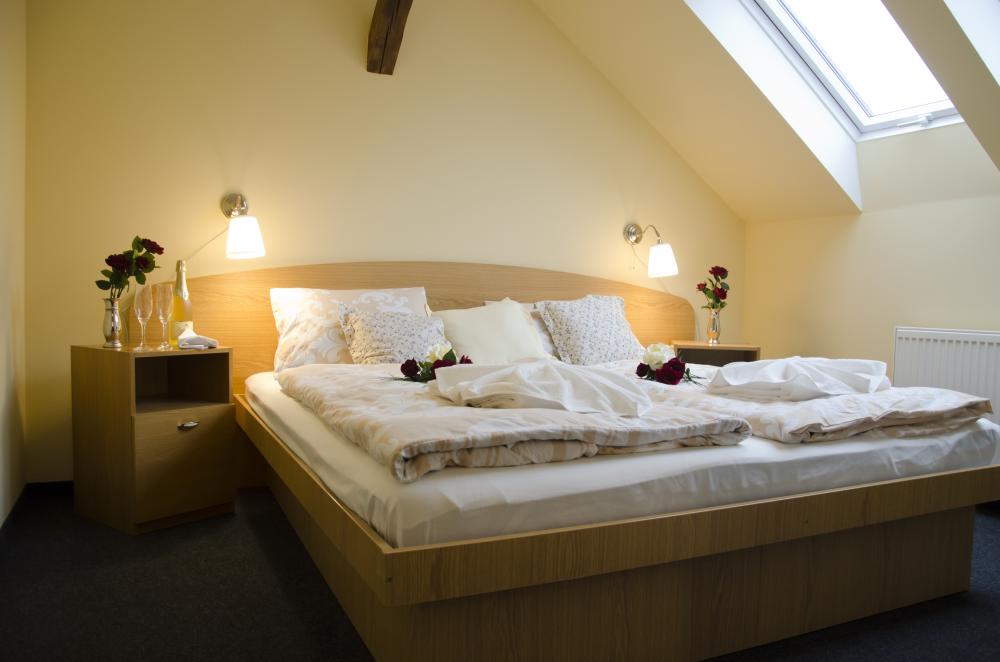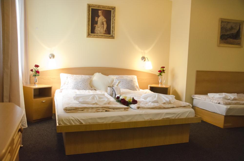 Třílůžkový pokoj se nachází ve staré části, přímo nad recepcí penzionu. Třílůžkový pokoj nabízí komfortní ubytování až pro 3 dospělé osoby, jednu manželskou postel a jedno jednolůžko. Do pokoje je možné přidat i jednu přistýlku po předchozí dohodě s recepcí. Dále zde můžete najít koupelnu se sprchou a toaletou včetně toaletních potřeb zdarma, satelitní TV s plochou obrazovkou, konvici a set na přípravu kávy a čaje. Wi-Fi připojení je v celém objektu. Pro všechny naše hosty je připravené bezplatné parkování přímo před penzionem.
