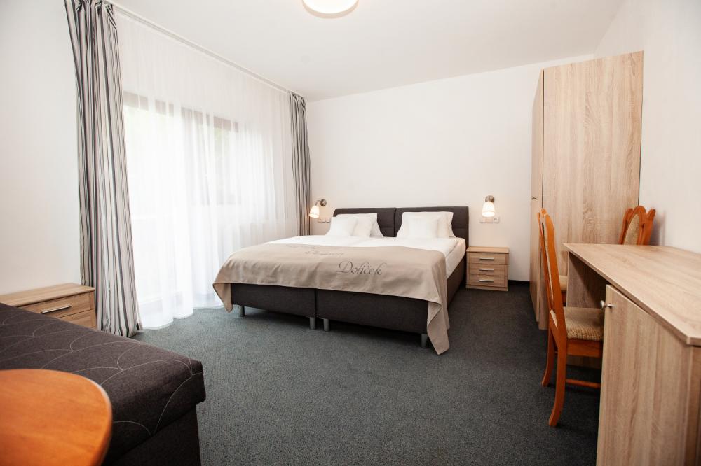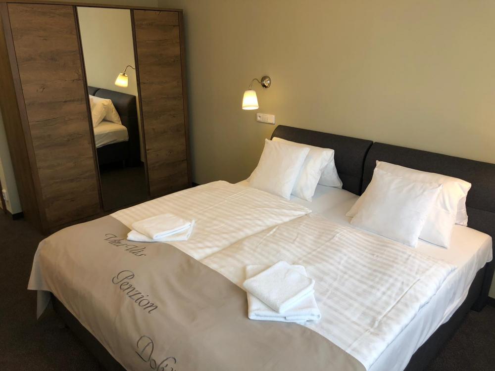 Dvoulůžkový pokoj se nachází v noví části penzionu na přízemí, odkud je vstup na terasu s příjemným posezením. Pokoj nabízí velkou dvoulůžkovou postel (180 x 200 cm), posezení se stolem, set na přípravu kávy a čaje s konvicí, minilednici a TV s plochou obrazovkou. Samozřejmostí je internetové Wi-Fi připojení. Pokoj má vlastní koupelnu se sprchou a toaletou, základní toaletní potřeby mají u nás hosté zcela zdarma. Bezplatné parkování je zajištěno přímo před penzionem. Rezervace není nutná.