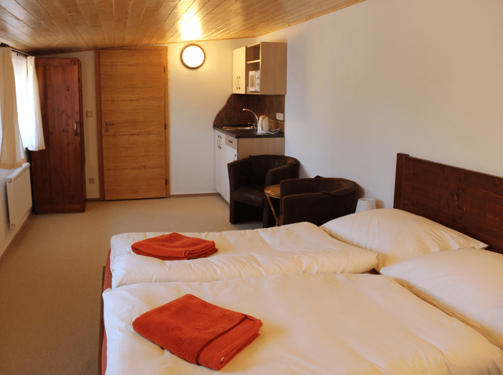 7 pokojů Přízemí 4 dvoulůžkové, 1 přistýlka, společná vybavený kuchyňka Podkroví 3 dvoulůžkové, 8 přistýlek, každý pokoj má vybavený kuchyňský kout, ubytováváme přednostně na 2 a více nocí