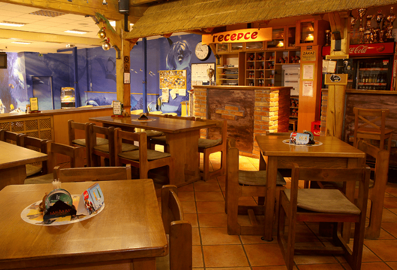 S restaurací sousedí i salonek s tanečním parketem a nechybí ani venkovní posezení s trampolínou a dětským hřištěm. (stojany i závěsné držáky na kola samozřejmostí).