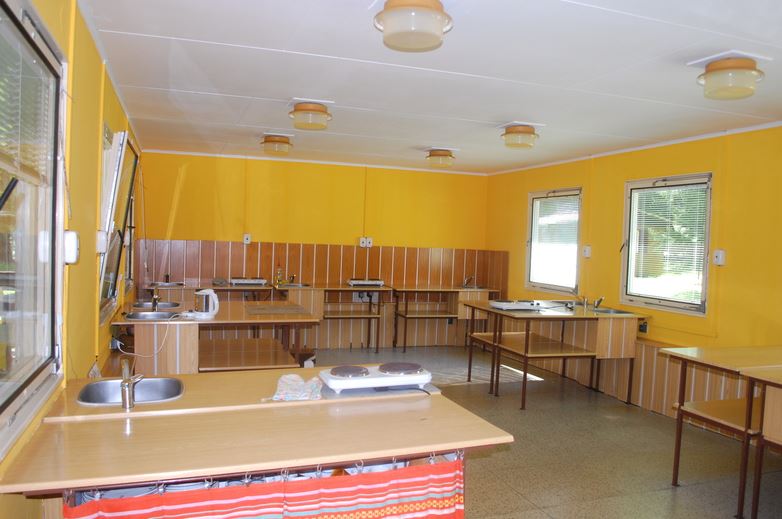 Příprava jídel probíhá v kuchyňce, která je vybavená vařiči, lednicemi a upraveným ohništěm.